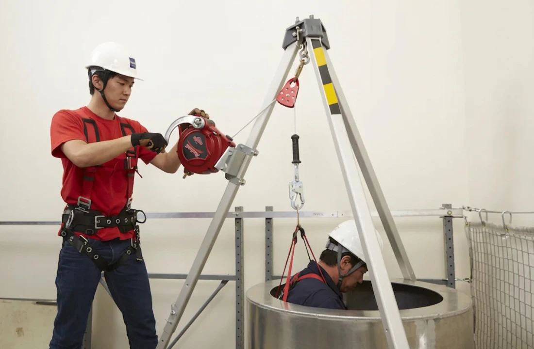 【A】本商品は、マンホールやタンクなどの閉所作業において、作業者の墜落防止と緊急時の迅速な救助を目的とした装置です。ウィンチ機能付きの安全ブロックと三脚により、少人数でも迅速な救助が可能となり、作業現場の安全性が向上します。特に、酸素欠乏症や有毒ガスによる意識喪失時の救助に効果的です。